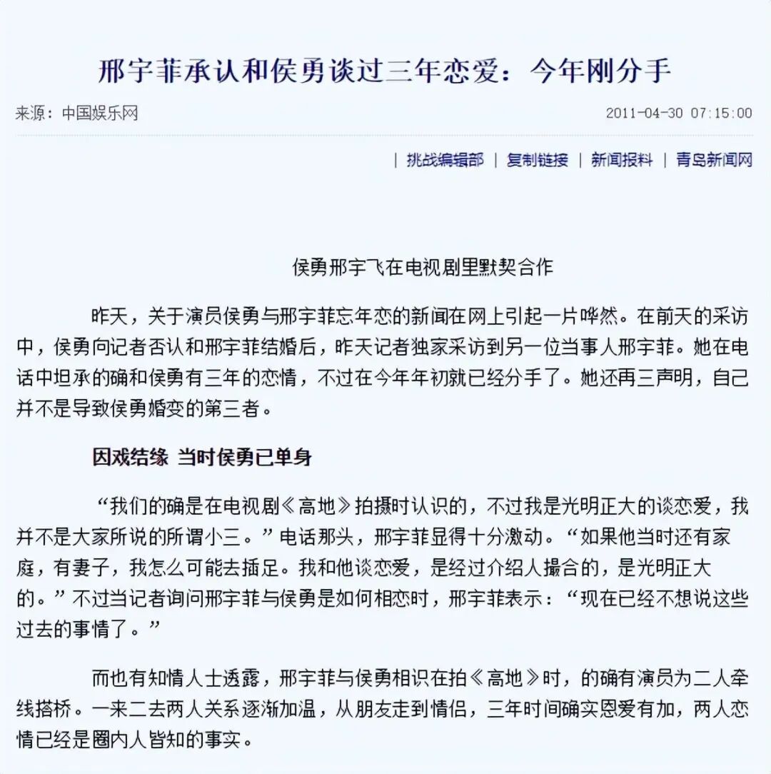 甚至没多久郉雨菲本人都承认了这段恋情,同时否认自己插足侯勇之前的婚姻。