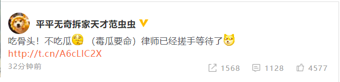 近日,有媒体称拍到某耽改剧男主“白天耽美炒CP,晚上酒店会网红”,并根据此爆料画了漫画,有网友根据漫画猜测男主可能是范丞丞。随后,范丞丞的宠物微博发文辟谣:“吃骨头!不吃瓜(毒瓜要命)律师已经在搓手等待了!”
