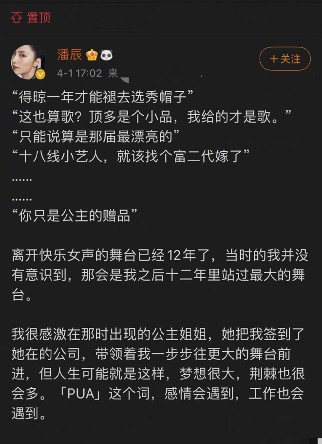 潘辰发长文倾诉自己遭遇职场PUA。选秀歌手不值钱、音乐作品是喜剧、靠脸吃饭、十八线的艺人就该找个富二代嫁了……不仅是职场PUA,也是娱乐圈的PUA。最后说自己不是任何人的赠品,是不止眼前所见的潘辰。