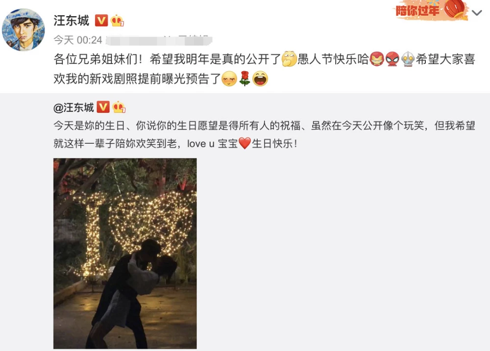 昨天愚人节,汪东城晒出一张接吻照“公布恋情”,他还写道:“虽然在今天公开像个玩笑,但我希望就这样一辈子陪妳欢笑到老”。今日,汪东城发文否认公开恋情,表示昨天在和大家开愚人节玩笑,接吻照其实是剧照,他还说希望自己明年真的可以和大家分享好消息。