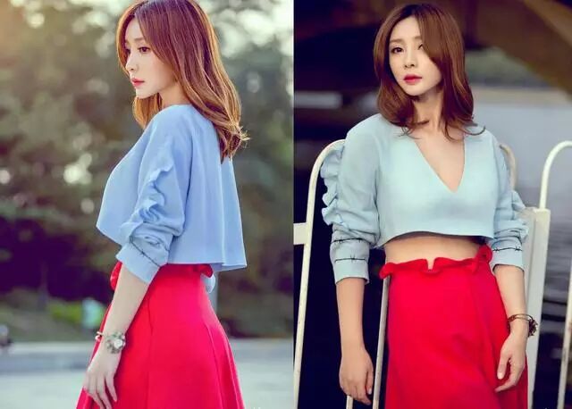 整个街拍画风充满了秋意,长袖深V露腰上衣搭配红色伞裙再配上柳岩式(四六分)的斜刘海显得时尚大气!