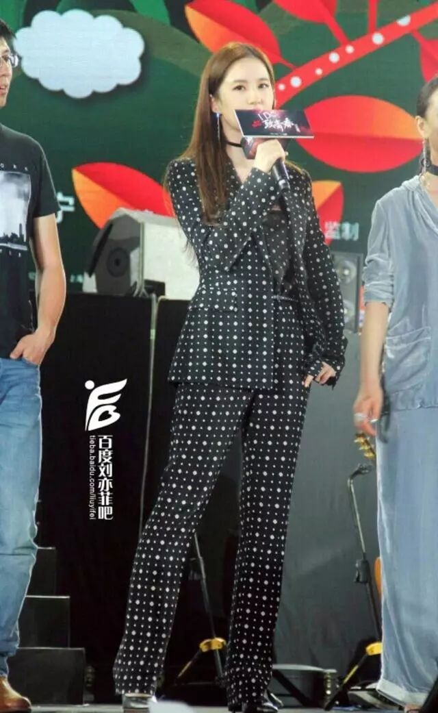 近期都流行穿西装套装,刘亦菲穿一身波点西装套装,脚踩黑色高跟鞋,很帅气总攻范十足。