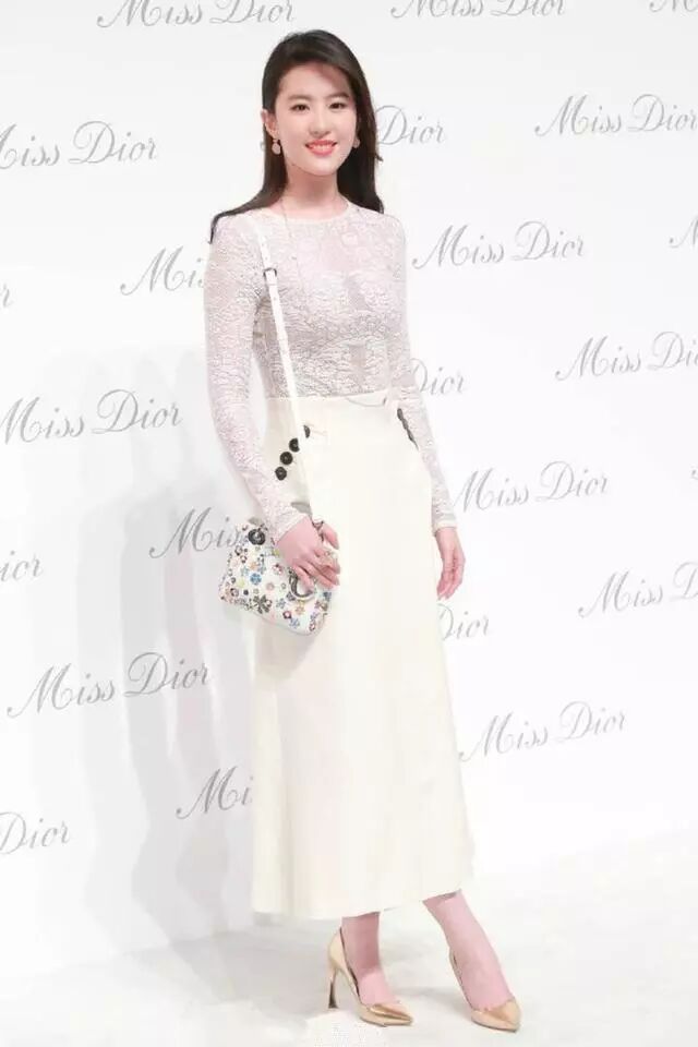 刘亦菲气质就是好,穿一袭白色蕾丝上衣搭配白色长裙,脚踩金属色高跟鞋,很有小女人的气息。
