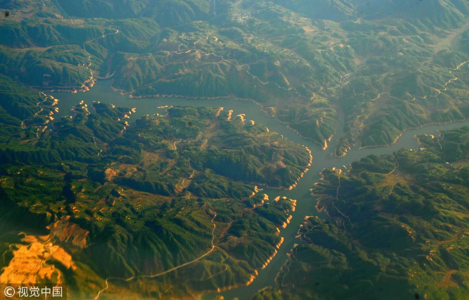 俯拍福建丘陵。可见地形复杂,水道崎岖,交通不便。/ 视觉中国