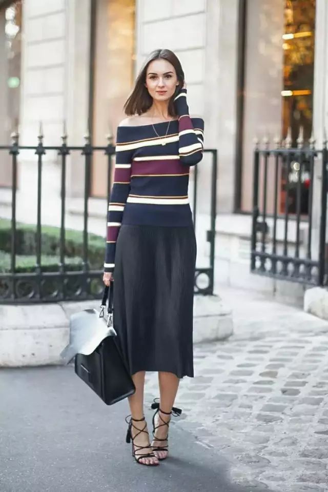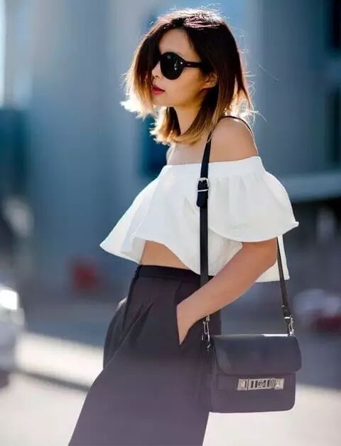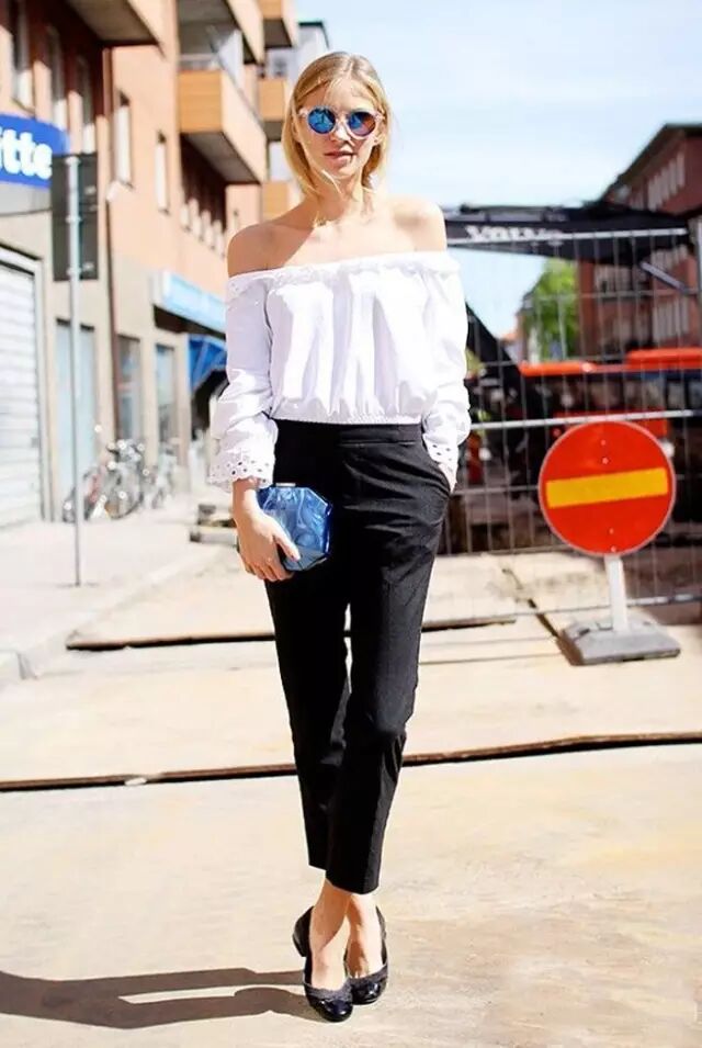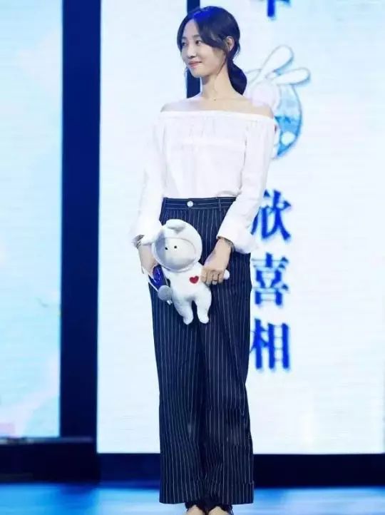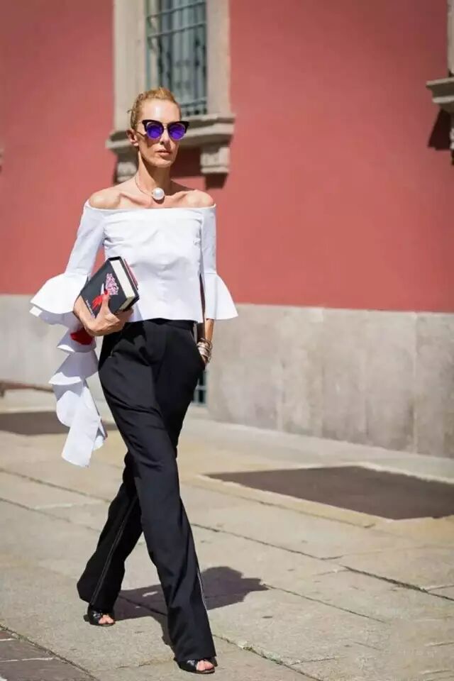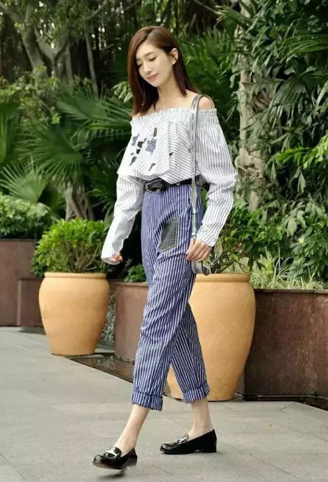白百合一字肩上衣搭配chanel条纹阔腿裤