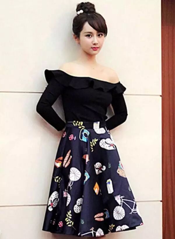 杨紫的黑色一字肩上衣搭配复古伞裙