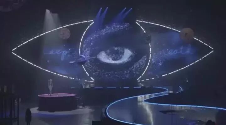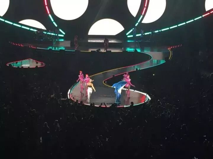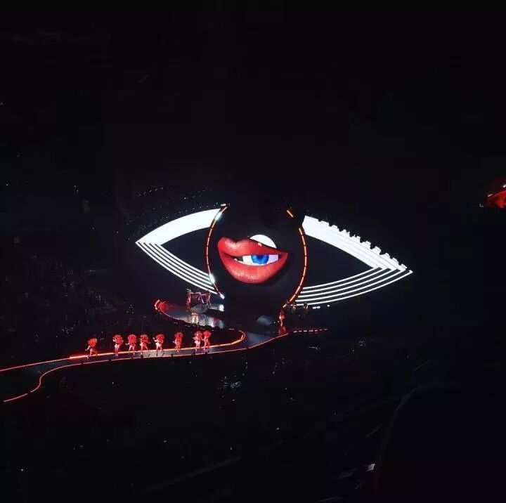 当观众们进入这次演唱会现场场时,他们看到了一个巨大的舞台,有一个超大的眼状视频墙,一个T台舞台,一个延伸到观众边的舞台,这个舞台像一个泪珠。