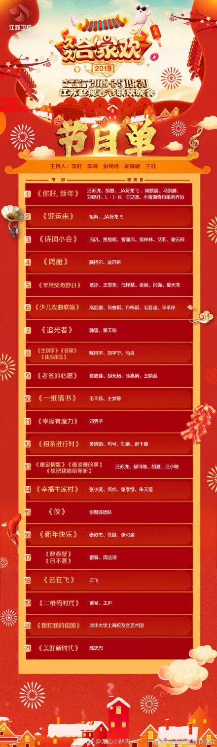 晚会亮点 | 实力唱将毛不易和腾格尔实力领衔,摩登兄弟刘宇宁将加盟江苏卫视元宵晚会,并带来精彩表演。更有各大新锐唱将加盟。 |