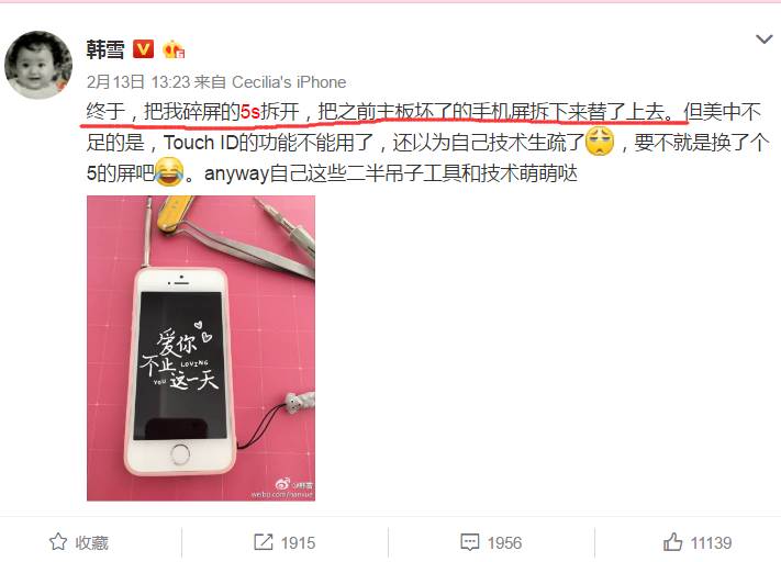 之前,韩雪就在微博上晒出过自己修手机的照片。她自己的5s屏幕坏了,她就是自己动手拆开替换的。