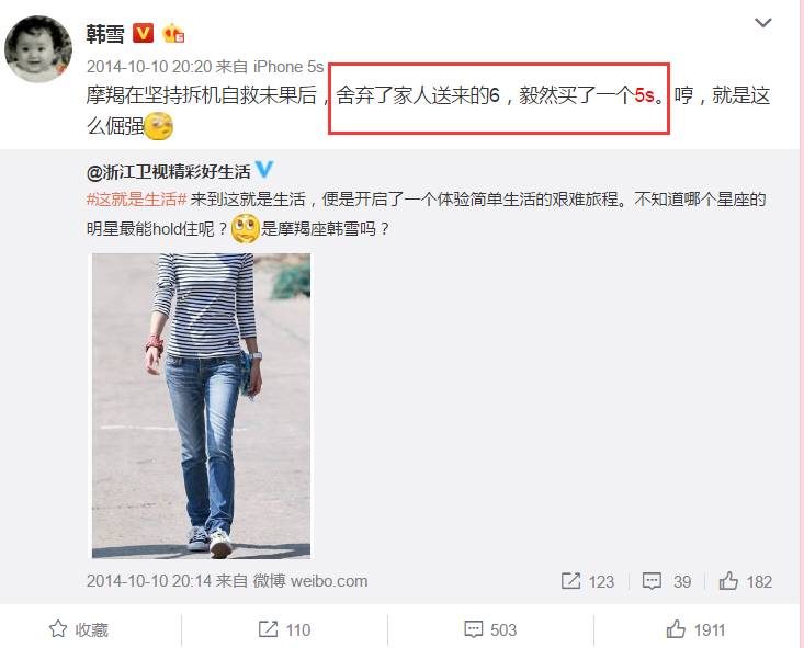 现在不买新苹果,估计也只是因为韩雪很爱5s这个造型而已吧,之前坏了一部,家人给了6,她还是换了回去。