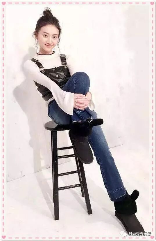 一套少女感十足的搭配,修身白毛衣加牛仔背带裤,脚上一双冬天标配的雪地靴,上边还有着可爱的耳朵。
