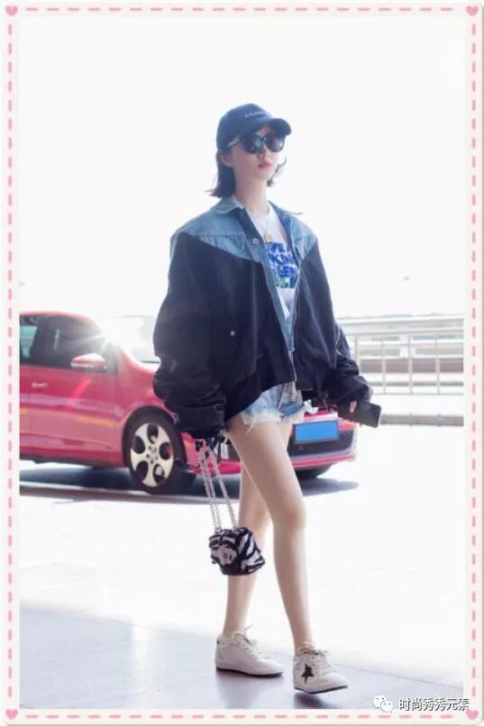 机场的穿搭中,一件白色的内搭,下边是一条浅色的牛仔短裤,脚上是百搭的小白鞋,本身比较基础的搭配被外套拉升了时尚感,外套的颜色和款型设计都非常吸睛。