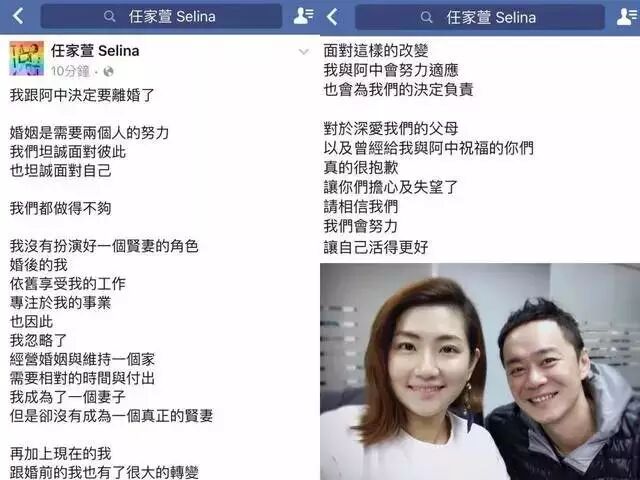 3月初,S.H.E成员Selina任家萱在脸书上宣布,和张承中的五年婚姻走到尽头。她在长文中表示,自己在婚后沉浸于事业中,没有扮演好一个妻子的角色。但在离婚后,他和张承中依旧是好朋友,因为他们失去了爱情,不想继续失去亲情、友情。