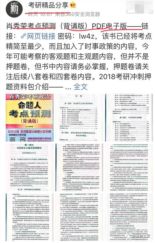 之前腿姐和徐涛的背诵笔记以及风中劲草出来以后,现在肖秀荣老师的考点预测背诵版也已经出版,大家如果以前是跟的肖秀荣老师的资料(比如精讲精练和1000题及知识点提要等)可以继续用这本书学习,小编最近在微博找到这本书的电子版的分享链接,感兴趣的同学可以前往微博【考研精品分享】下载: