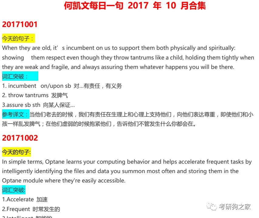 何凯文的每日一句照常更新中,现在更新的是10月份的合集,因为腿姐每日一题很多同学也需要,所以我们也进行了合集的整理,希望对大家有帮助,需要的同学可以在微信公众号【考研狗之家】回复“考研福利”获取下载链接。