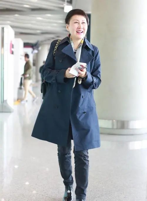 其实一直以来她的头发都是比较短,看起来就显得比较的干净利落,而且笑起来的时候真的看起来挺有亲和力的。身上穿的又是一件风衣外套,这件风衣外套有点类似于深蓝色,下面配的这条裤子就比较多的褶子。