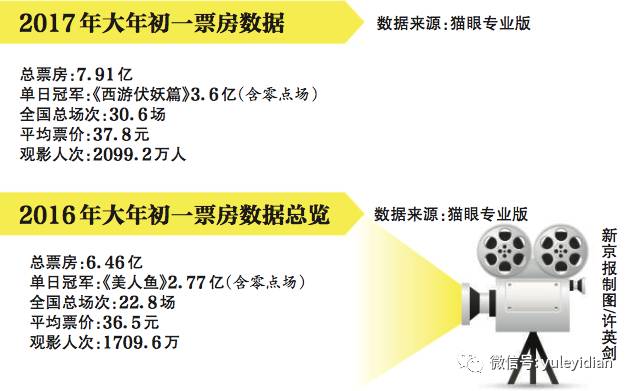其中,“头号种子”《西游伏妖篇》(上图)公映19.5个小时后突破3.12亿,单日票房3.48亿,刷新去年《美人鱼》保持的华语片单日最高票房纪录(2.77亿),并创下华语片最快突破2亿纪录、华语片最快突破3亿纪录。初一当天,6部新片就有3部过亿,这3部电影票房总和达6.67亿,超过了去年初一的票房总和。