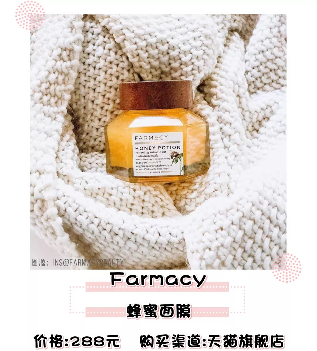 Farmacy的蜂蜜面膜是美国丝芙兰的爆款断货王,成分中有蜂蜜、蜂胶、蜂王浆,就是皮肤的蜂蜜盛宴。使用方法是均匀涂抹在脸上按摩1-2min,面膜会变成白色乳霜状,停10-15min洗干净就好。