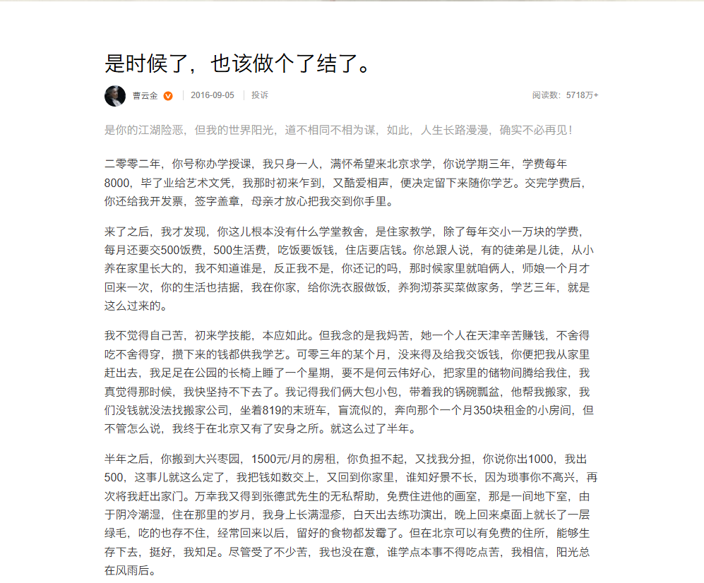 2016年,郭德纲公布德云社最新家谱,措辞极其严厉——“曾用云字艺名者二人,欺天灭祖悖逆人伦,逢难变节卖师求荣”。曹云金随即发六千字长文《是时候了,也该做个了结》,历数学艺期间每年交8000多元学费、睡公园长椅、拍戏零片酬等“罪状”。