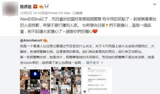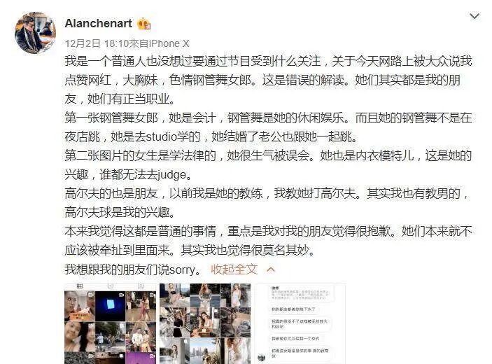 但Alan出来回应了,解释说网友口中的“网红、大胸妹、钢管舞女郎”都是他的朋友,人家有正当职业的。