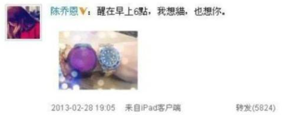 当时陈乔恩发微博“我想猫,也想你”,配图里的手表正好霍建华有同款,复合传闻一时甚嚣尘上~