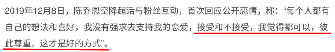 最后陈乔恩空降粉丝超话,表示“接受和不接受都可以,彼此尊重才是好的方式。”