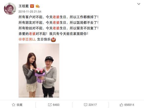 现在王祖蓝变身爱妻狂魔,在微博也是秀恩爱停不下来。