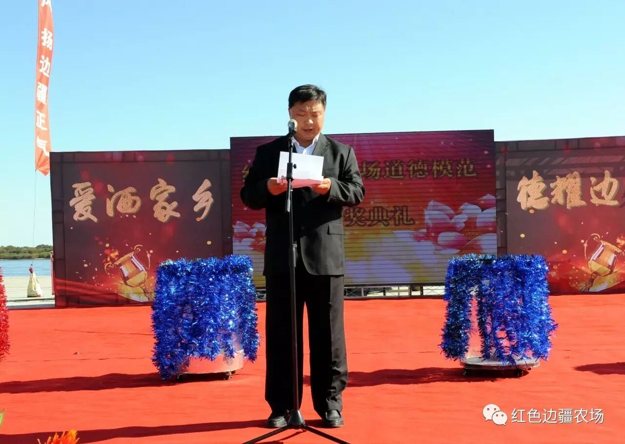 颁奖典礼现场,红色边疆农场党委书记秦玉国代表农场党委向获奖的道德模范表示祝贺和崇高的敬意,向热心支持、积极参与、辛勤付出本次活动的工作人员、演职人员、现场人员表示衷心的感谢。