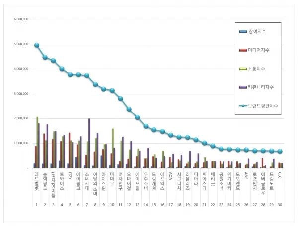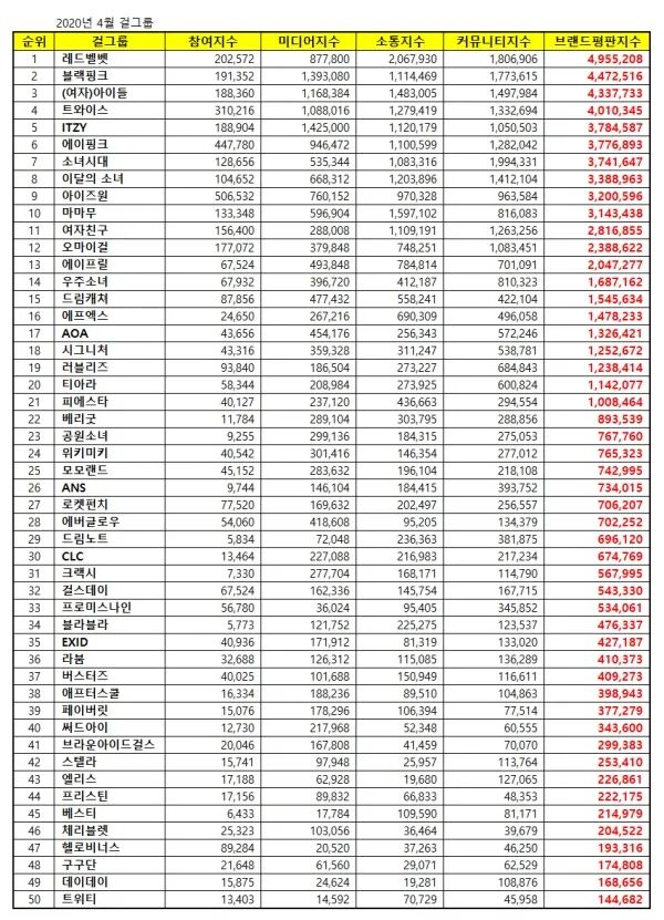 12日,据韩国企业评价研究所公开的最新数据,针对2020年3月10日至4月11日期间女团70,017,904个品牌评价大数据进行分析后发的结果显示,RedVelvet以4,955,208的品牌评价指数获得一位!另外2到10位分别是BLACKPINK,(G)-IDLE,TWICE,ITZY,Apink,少女时代,本月少女,IZONE,MAMAMOO。