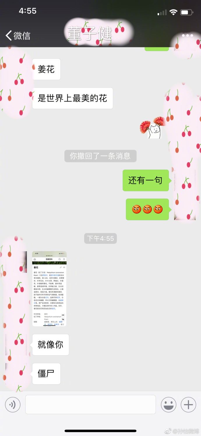 这不,昨天孙怡还在个人社交平台发了一张和董子健的聊天记录,还配文“我宣布他完了”,并配了一个微笑的表情,从配图的微信聊天记录来看,似乎是董子健正在调侃孙怡热播剧中的角色名字。