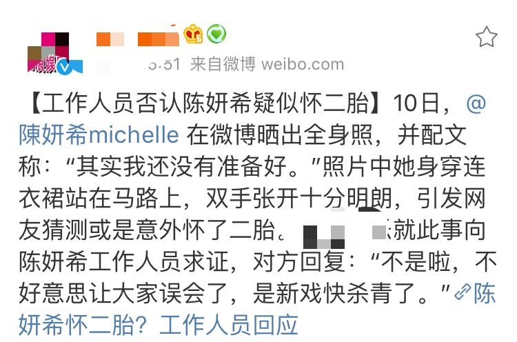 对于陈妍希这条意味不明的发文,许多网友猜测她怀了二胎,对此有媒体向陈妍希的工作团队进行求证,他们称陈妍希只是因为新戏杀青而不舍,并不是怀了二胎。