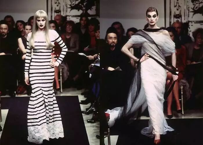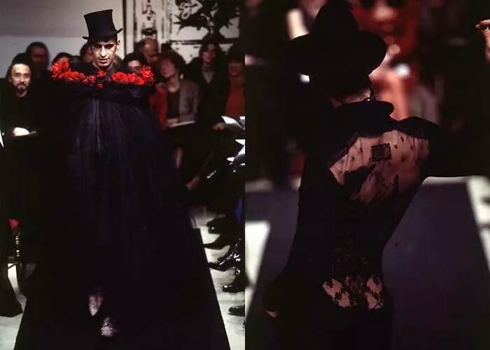 Jean Paul Gaultier算是跨性别设计中的佼佼者,同时也赋予了男性不同的柔美,在他首个高定系列中,就让壮硕的男模穿上了蕾丝露背装,条纹纱织裙,极具视觉穿透力的时装表达,令这一切成为经典。