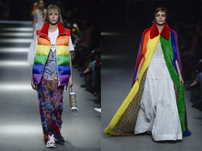 在年初的2018伦敦秋冬时装周上,Christopher Bailey为我们的献上了他在Burberry工作17年中的最后一个作品,整场大秀都被彩虹包裹,每一次Look上的彩虹元素都透露出他的决心,做为LGBT群体中的一员,他最后还为品牌开创性的开启了LGBT+彩虹慈善计划。