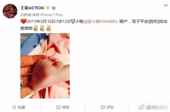 4. 王雷刚刚报喜,爱妻李小萌于2017年5月10日7点12分顺利产子,母子平安!恭喜王雷今年2月宣布李小萌怀孕,两人于2013年10月步入婚姻殿堂,曾合作过《平凡的世界》《十送红军》等作品,生活中也十分恩爱甜蜜。