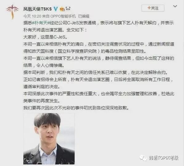 其经纪公司C-JES也宣布与朴有天解约,停止他的所有演艺活动,朴有天退出娱乐圈,诚实接受调查。