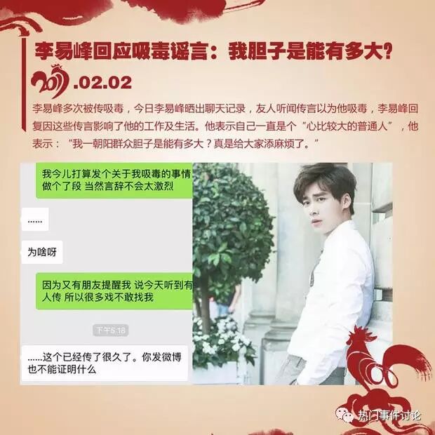李易峰多次被传吸毒,今日李易峰晒出聊天记录,友人听闻传言以为他吸毒,李易峰回复因这些传言影响了他的工作及生活。他表示自己一直是个“心比较大的普通人”,他表示:“我一朝阳群众胆子是能有多大?真是给大家添麻烦了。”