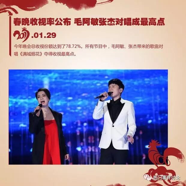 今年晚会总收视份额达到了78.72%。所有节目中,毛阿敏、张杰带来的歌曲对唱《满城烟花》夺得收视最高点。