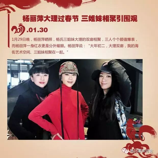 1月30日,著名舞蹈家杨丽萍爆照,杨氏三姐妹大理的双廊相聚,三人个个颜值爆表,而杨丽萍一身红衣更是分外耀眼。杨丽萍说:“大年初二,大理双廊,我的海街艺术空间、三姐妹相聚在一起。”