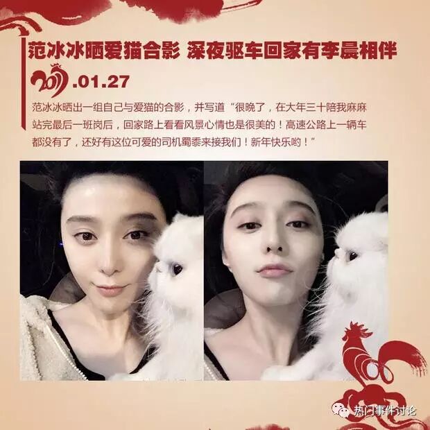 一年又一年,春节过完了,大家玩得还好吗?春节期间,贵圈发生不少事情,作为社交达人的你们怎么能错过?没看新闻没关系,这就带你回顾下春节期间贵圈发生的事情,组图在手,看完全有!大年三十范冰冰晒出一组自己与爱猫的合影,并写道“很晩了,在大年三十陪我麻麻站完最后一班岗后,回家路上看看风景心情也是很美的!高速公路上一辆车都没有了,还好有这位可爱的司机蜀黍来接我们!新年快乐哟!”
