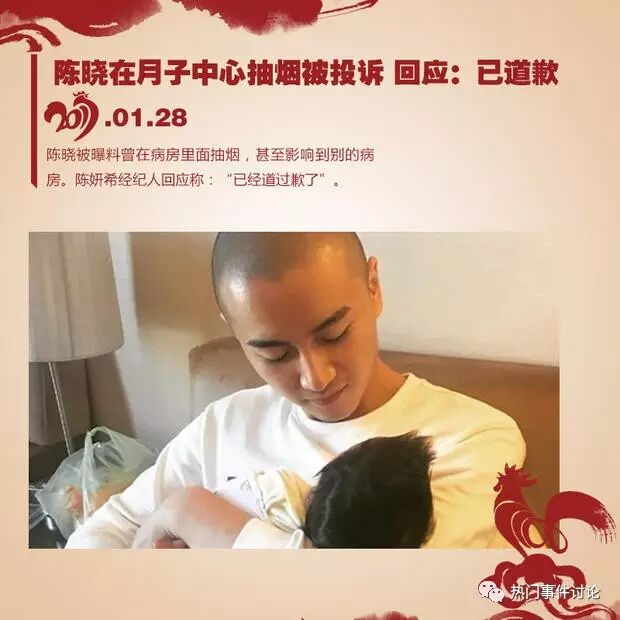 1月28日,陈晓被曝曾在月子中心的病房中抽烟,甚至影响到其他病房。据曝料者称,虽然有前去提醒,但陈晓还是再犯,第2次时护理师便硬着头皮去劝阻,当时陈妍希也感到很不好意思,结果他就很用力地开门走了出去”对此,陈妍希的经纪人回应称:“已经道过歉了”。