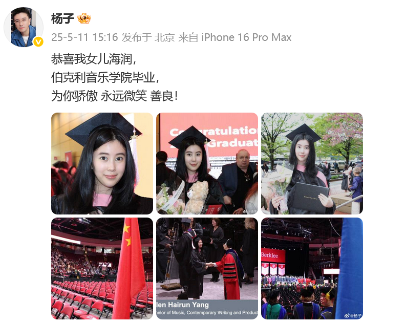 5月11日,杨子发文恭喜大女儿杨海润从伯克利音乐学院毕业,引发热议。