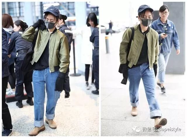 军绿色飞行夹克是现在比较普遍的单品,搭配上也是有无数可能性。内搭黑色T恤+牛仔裤,经典耐看,街头十足。
