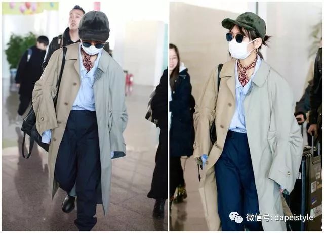 比如这一身,风衣外套内搭浅蓝色衬衫+深蓝色长裤。首先浅蓝+深蓝得组合,是现在流行的同色系不同色调的穿搭组合,其次就是风衣外套经典百搭,最后是颈上的红丝巾,点亮全身,“颈”上添花。