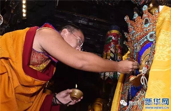 7月27日,班禅朝拜拉萨大昭寺释迦牟尼佛像,并为佛像涂金粉。新华社记者 觉果 摄