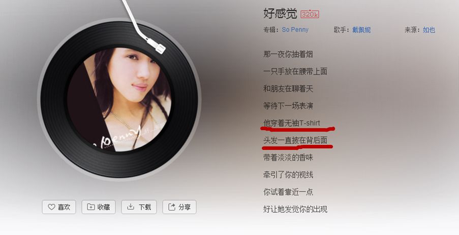 2004年以她名字命名的专辑《So Penny》有太多传唱度极高的歌曲,比如失恋必备《街角的祝福》;难舍旧爱的《怎样》;再比如女性意识觉醒的《辛德瑞拉》;自我释放的《水中央》。犹记得高一初恋,从学校回家,站在公交车站,满腹情绪,厚重CD单曲重播的是她的那张专辑里的《防空洞》。当然今天要八卦的是她的情歌故事。