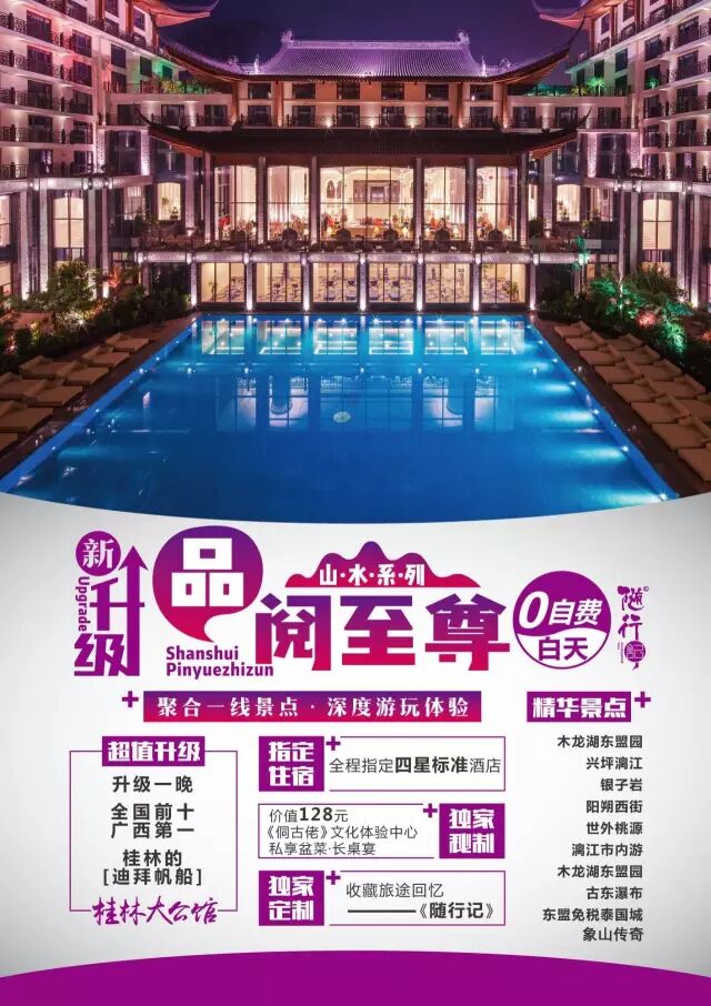 此线路聚合大桂林旅游圈最具影响力景区,经由万名游客亲身体验,不断迭代,巅峰升级堪称“桂林迪拜帆船”的广西超五星级酒店,让您的旅途锦上添花,回味无穷!