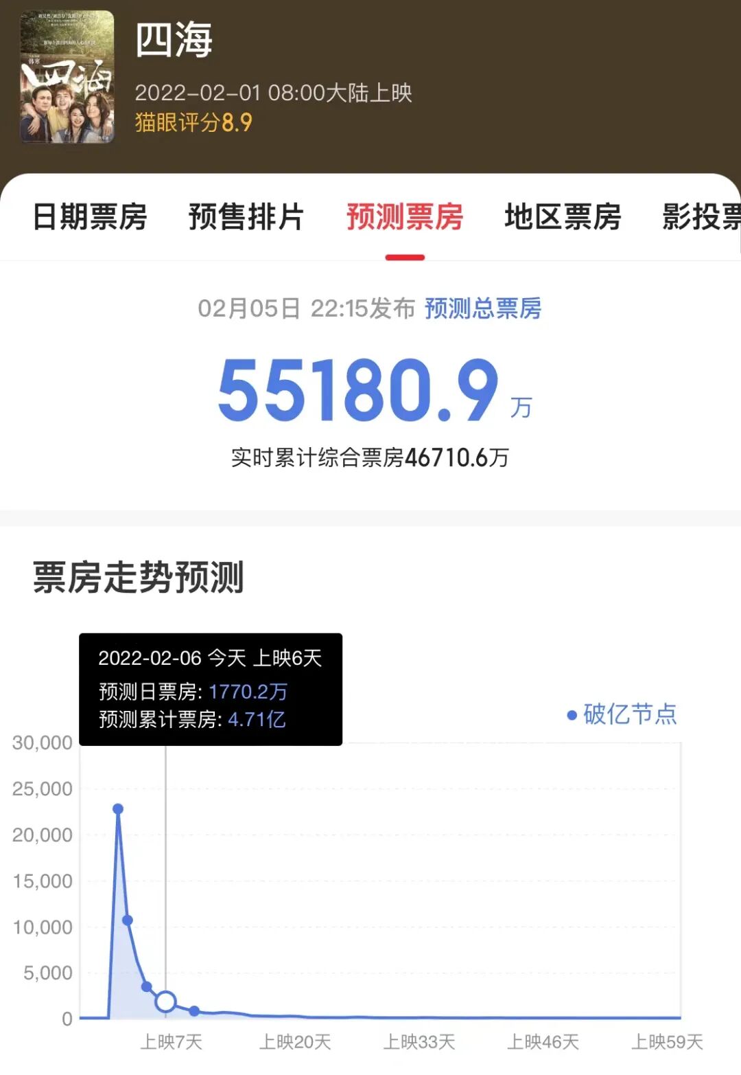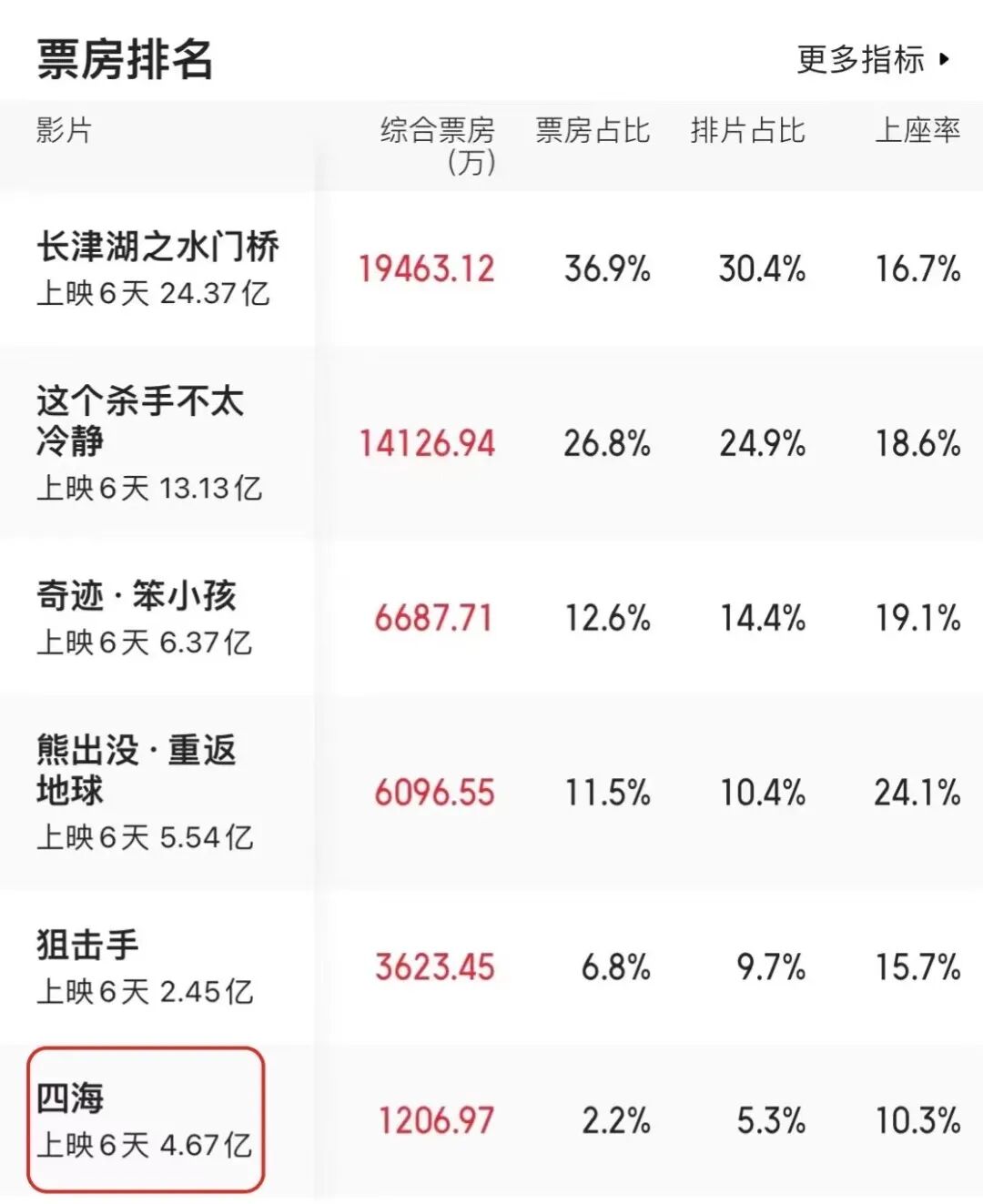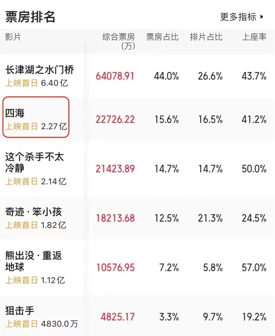 观众原本的期待值很高。大年初一首日票房和排片量都排在第二,仅次于《水门桥》。结果当天下午,#四海难看#就上了热搜。豆瓣评分5.6,春节档最低分,也是唯一一部分数不及格的。
