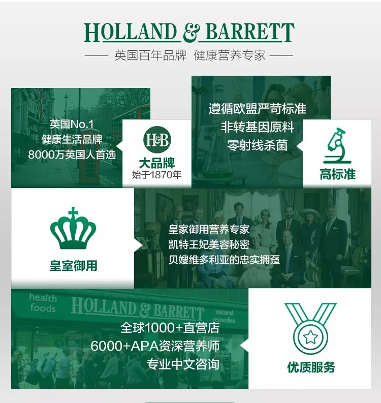 Holland & Barrett(官方中文名叫做荷柏瑞,大家一般都简称HB)是英国最有名的优质健康产品连锁店,拥有近百年的历史,毫不夸张的讲,不管你在英国的哪个城市或小镇都能看到它的身影。HB以一流的天然健康食品闻名,要知道英国对于所有入口的东西,尤其是药物和保健品类,有相当严苛的检验标准,HB的所有产品可都是通过层层严格品质检定才能上架的,是非常有保障的专业保健食品店。