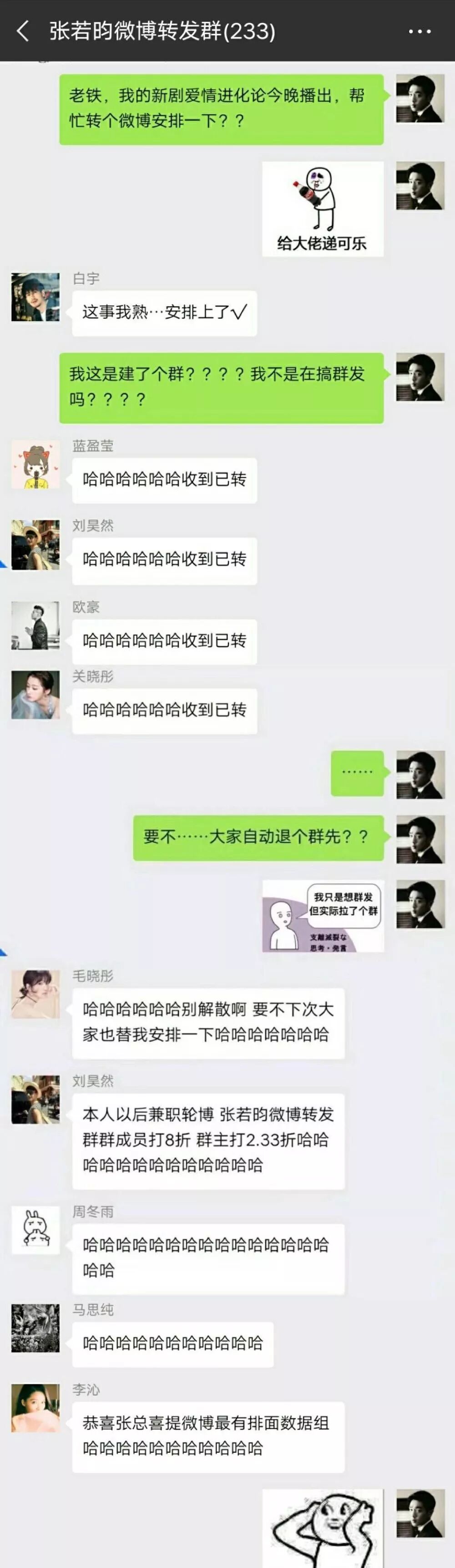 粉丝们开始不知道,其实不熟悉操作的张若昀不小心将消息群发搞成了建群,所以这些好友都是被他拉到一个群里然后收到通知的。