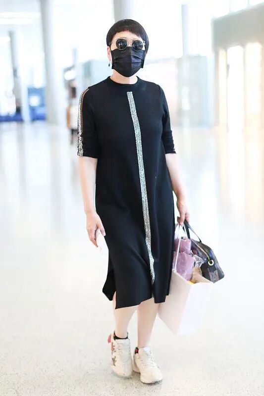 整个人包裹的比较严实,倒是感觉这张照片还是经过了后期的加工处理,显得整个人的肤色特别的白白到发光的地步,并且穿了一条黑色的裙子,选择的是开叉的设计下面穿了一双白色的运动鞋